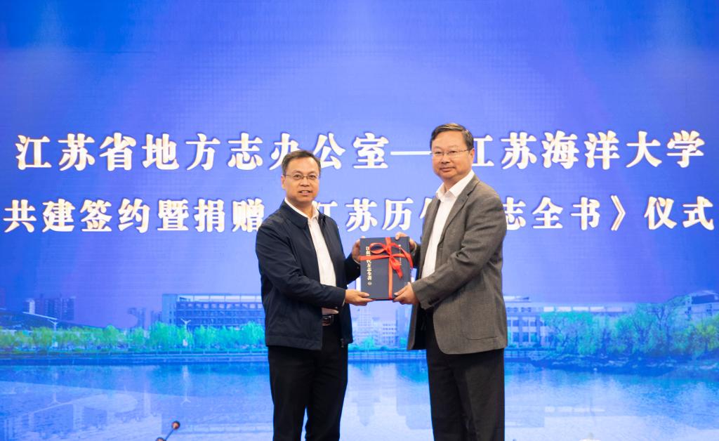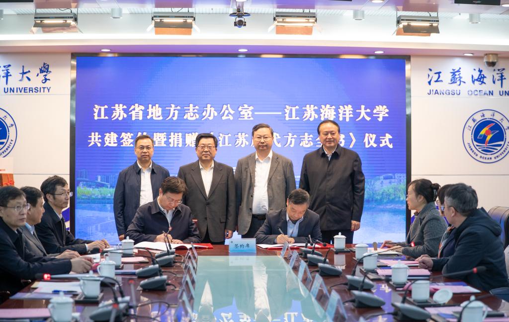 双方代表签署了战略合作框架协议,将在地方志学科建设、理论研究、资源开发利用、方志文化推广等方面深化战略合作。为充分发挥双方学术人才和学术资源优势,省地方志办公室、江苏海洋大学、江苏新闻广播联合推出“海上丝绸之路江苏寻迹”专栏,省地方志办公室与江苏海洋大学合作共建“江苏海洋文化研究院”,联合开展海洋文化类课题项目研究,承接相关部门关于海洋强省建设等方面的项目。“江苏海洋大学海洋经济文化研究中心”加入“江苏省方志馆联盟”,共同打造区域特色文化品牌。左健伟、宁晓明共同为“江苏海洋文化研究院”和“江苏省方志馆联盟”揭牌。