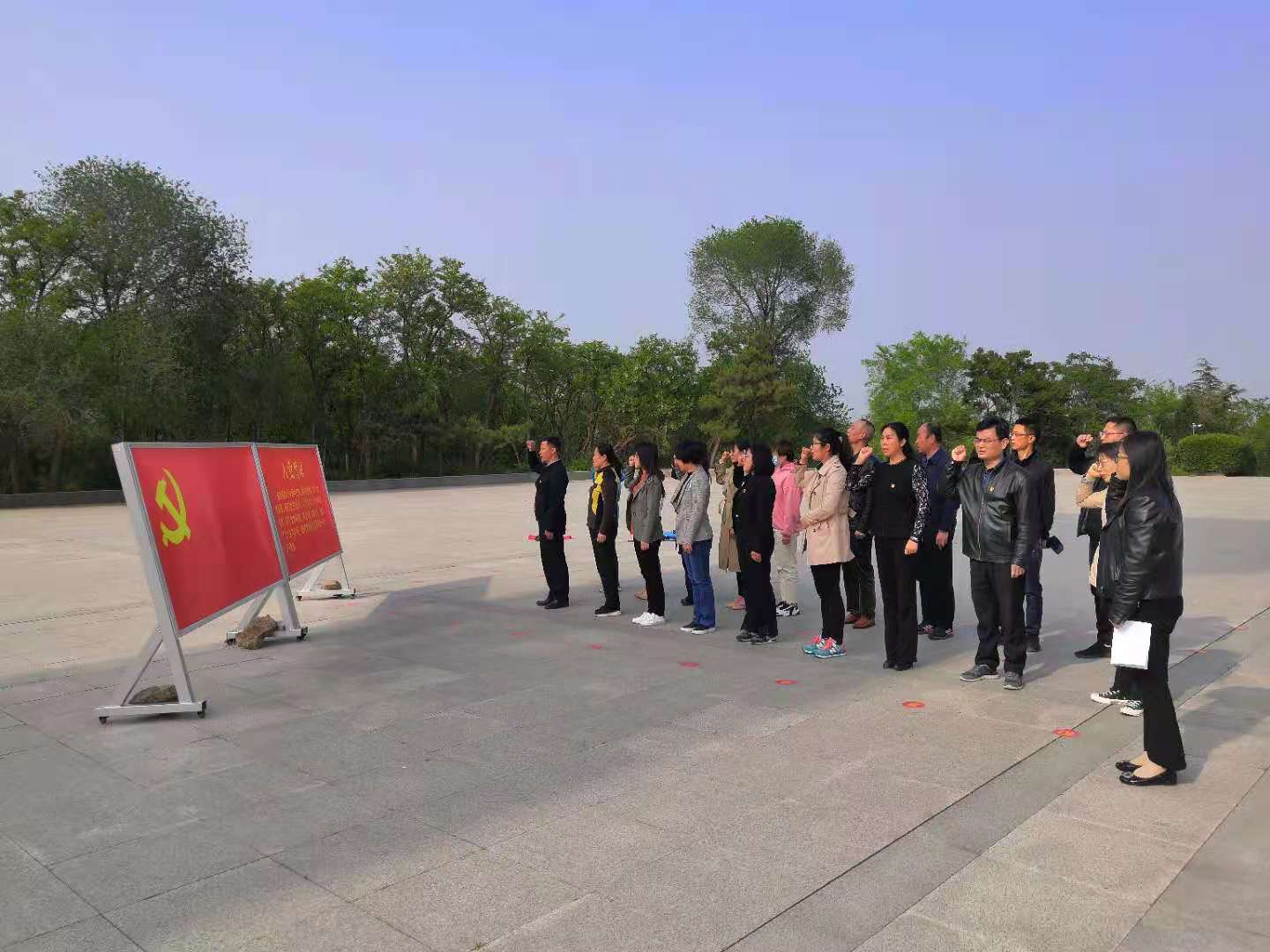 在庄严肃穆的氛围下,大家来到安峰山事件烈士纪念塔,怀着对先烈们的无限崇敬之情,向烈士敬献鲜花,肃立默哀表达对先烈的深切缅怀和无限敬仰。在纪念塔前,孙安英书记领誓,全体党员面向党旗,重温入党誓词,重新体会入党时的激动与庄严,感受作为一名共产党员的关荣与自豪。随后绕行烈士纪念塔一周注目瞻仰,致敬革命英雄。