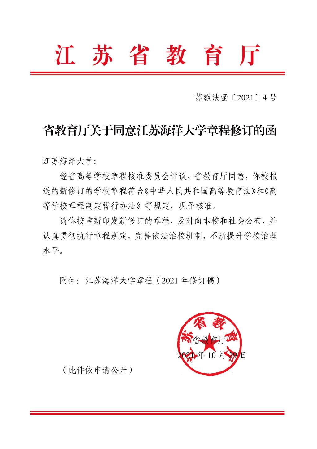 近日,江苏省教育厅下发《省教育厅关于同意江苏海洋大学章程修订的函》(苏教法函〔2021〕4号)。经审查,章程修正案符合《中华人民共和国高等教育法》和《高等学校章程制定暂行办法》规定,准予核准。至此,我校新一轮章程修订工作已经完成全部法定程序。