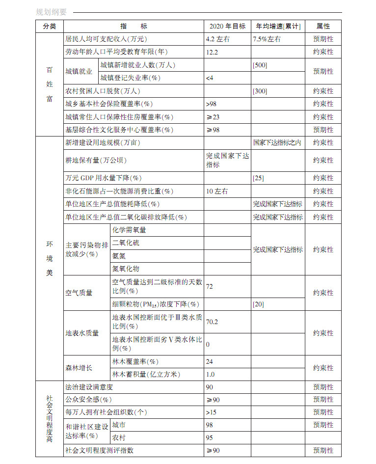 ——经济综合实力显著增强。经济保持中高速增长,提前实现地区生产总值和城乡居民人均收入比2010年翻一番。地区生产总值达到10万亿元左右(2015年价,下同),年均增长7.5%左右,居民收入增长与经济增长同步。供给侧结构性改革和经济转型升级取得明显成效,发展质量和效益显著提升,全员劳动生产率比2015年提高40%左右。