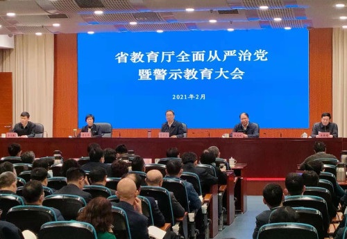 2月25日,省教育厅召开全面从严治党暨警示教育大会,深入学习贯彻习近平新时代中国特色社会主义思想、党的十九届五中全会、十九届中纪委五次全会、十三届省纪委六次全会和省级机关党的建设工作会议精神,全面总结2020年厅机关党建工作,分析党风廉政建设形势,研究部署2021年厅机关党的建设任务,为推动全面从严治党向纵深发展,努力在全省教育现代化新征程上取得新成效凝聚智慧和力量。省教育厅厅长、党组书记、省委教育工委书记葛道凯,省纪委监委派驻省教育厅纪检监察组组长李文飙出席会议并讲话,机关党委书记汪国培主持会议。